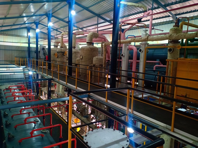 The distillation occurs in three stages under vacuum (zero oxygen), retaining better oil characteristics. The first stage occurs in an economizer, followed by a flasher, which evaporates the solvent, leaving only oil. The oil is further treated with open steam to remove any residual solvent.